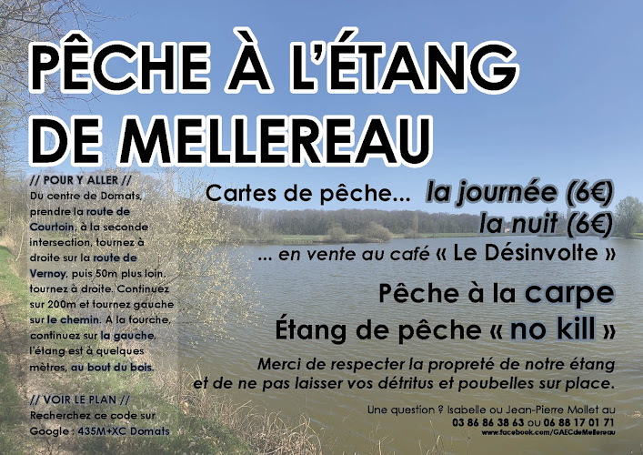 L'Étang de Mellereau est situé à Domats, dans la région Bourgogne-Franche-Comté, département de l'Yonne. Il s'agit d'un plan d'eau localisé en milieu rural, dans une zone où l'occupation des sols est majoritairement agricole et forestière. Cet étang est un lieu de pêche accessible au public, mais les informations précises sur les espèces présentes, la réglementation spécifique, la superficie, la profondeur moyenne, les cartes de pêche acceptées, les tarifs et les équipements disponibles ne sont pas documentées dans les sources consultées.